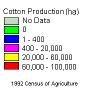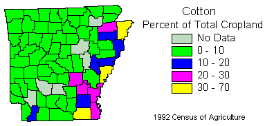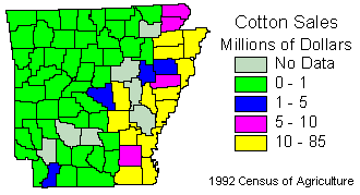 Total cotton production for Arkansas in 1992 was 360,000 hectares. Cotton sales for Arkansas in 1992 were 400 million dollars.