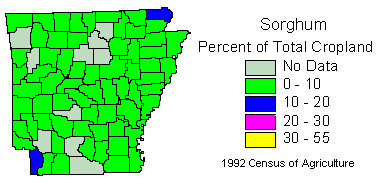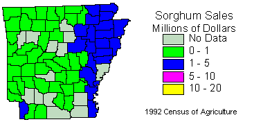 Total sorghum production for Arkansas in 1992 was 136,000 hectares. Sorghum sales for Arkansas in 1992 were 44 million dollars.