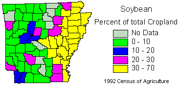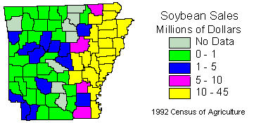 Total soybean production in Arkansas for 1992 was 1.2 million hectares. Soybean sales for Arkansas in 1992 were 513 million dollars.