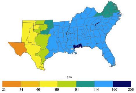 Precipitation Precipitation varies greatly across the Southern Region from about 200 mm/year in the semi-arid zone of western Texas to over 1900 mm/year in the Southern Appalachian Mountains of South Carolina, North Carolina, and Tennessee (Table 1). A large proportion of the southern region has annual rainfall in excess of 1000 mm. Gradients in rainfall occur in several states in association with changes in topography and proximity to the coast. Mean monthly and annual rainfall distribution maps for the Southern Region can be accessed at http://www.ocs.orst.edu/prism/prism_new.html. These maps were generated from weather records from national and some state monitoring stations for the 1961-1990 period. An interpolation technique, accounting for orographic effects on precipitation (Daly et al., 1994), provides precipitation estimates for locations without monitoring stations. The spatial distribution of mean annual rainfall for the southeast is provided in Fig. 1.
