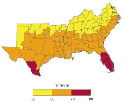 Air Temperature The range of minimum January and maximum July temperatures (Table 1) shows that parts of all but two states (Florida, Louisiana) have average January minimum temperature at or below freezing, whereas all states have areas above 30°C as a maximum average temperature in July. Most of the southern regional soils are thermic (15.0 to 22.2°C) (Daniels et al., 1973). Southern Florida and southern Texas have extensive hyperthermic (greater than 22.2°C) soils. Louisiana has a relatively small area with a hyperthermic regime. Soils in the mesic temperature class (8.3 to 15.0°C) occur in the northern portions of the region. The spatial distribution of mean annual temperatures for the southeast is provided in Fig. 2.