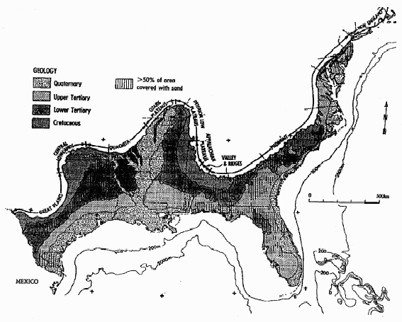 The Gulf and Atlantic Coastal Plains dominate landscape features of the southeastern United States. The Atlantic Coastal Plain extends southwestward along the eastern seaboard of the United States and is, at its southern end, continuous with the Gulf Coastal Plain that trends southwestward and dominates a broad area north of the Gulf of Mexico. The plains slope gently from interior highlands toward the Atlantic and Gulf coastlines with few elevations higher than 100 m. The coastal plains are underlain by sedimentary rocks of Cretaceous, Tertiary, and Quaternary age. Cretaceous rocks crop out in a discontinuous belt adjacent to the highlands. They are composed of terrigenous gravels and sandstone near the highlands and grade southward and eastward into beds composed of limestone and marl. Sediments of Tertiary and Quaternary age are present in successive outcrop belts in a coastward direction. The youngest sediments of the Quaternary age also are exposed along stream and river courses that flow across the Cretaceous and Tertiary outcrop belts.