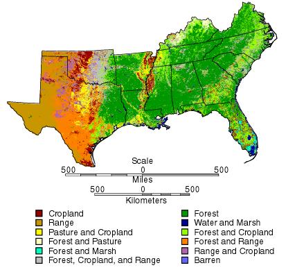 The areal extent of each landuse category by MLRA is presented in Table 2 and illustrates the diversity of landuse across the southern region of the United States. The Central Great Plains in Texas and Oklahoma (MLRAs 42, 77, and 78) tend to have a large proportion of the land area in the range category and a small proportion in forest. The proportion of the land area in cropland is low in MLRA 42 but is higher in MLRAs 77 and 78. In the East and Central Farming and Forest region (MLRAs 116A, 121, 123, 125, and 128) forest is the dominant landuse with some combination of forest and cropland. In the Mississippi Delta region (MLRAs 131 and 134), cropland and forest dominate the landscape. In the South Atlantic Gulf region (MLRAs 133A, 133B, 135, 136, and 137), forest is the dominant landuse category with smaller proportions of mixed cropland, pasture, and forest. In the Atlantic and Gulf Coast regions, forest, mixed forest, and cropland dominate the landscape.