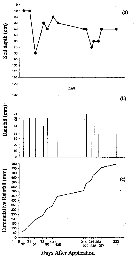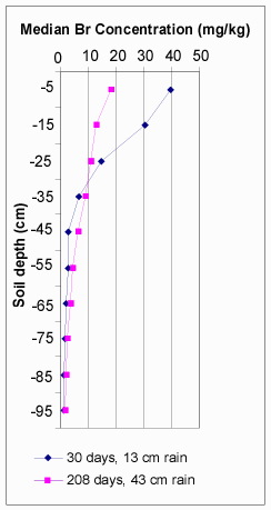 Bromide Transport Bromide recovered in the profile ranged from 77.6 to 18.1% (Table 10). The total amount of precipitation during the study period was 1027 mm with the highest precipitation event occurring 213 days following application (456 mm).