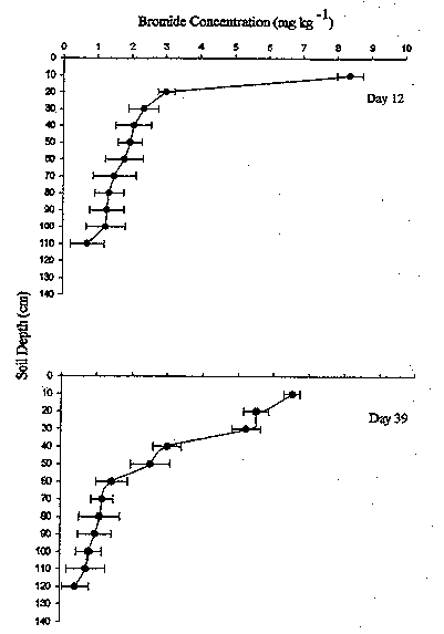 Concentration profiles of Br are presented in Figs. 3 and 4. The highest concentration was observed at the 10-cm depth 12 days after application. Thirty-nine days after application, peak concentration was located between 60 to 80 cm in the profile (Fig. 3). Peak concentrations were about 2.5 times lower at days 78 and 203 than days 12 and 39 (Fig. 4). Location of Br- at days 78 and 203 was between 30 and 50 cm. The locations of peak concentration of Br on various days following application are shown in Fig. 5. Depths of peak concentration fluctuated in the profile, however, Br concentration decreased with time.