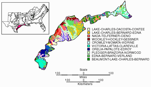 Soils Most of the soils in this area belong to the Gulf Coast Prairies major land resource area. The dominant soils in this area are the Lake Charles, Victoria, Edna, Bernard, Midland, Brazoria, Pledger, Orelia, Telferner, and Dacosta (Table 1). STATSGO soils are presented in Fig. 1.