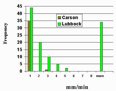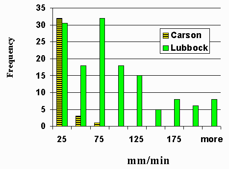 While the variation of infiltration rates of the data set are quite large, it must be remembered what the data are portraying. This Vertisol is beset with abundant, deep cracks when it’s dry. The thesis from which the data were obtained (Evans, 1990), evaluated the bimodal cracking pattern of the Randall soil. The variability of the data were similar to that presented by Talsma and van der Lelij (1976) in an Australian vertisol. Infiltration variability is not only within playas, but also among playas. Unpublished data (Zartman, 1997) shows greater infiltration rates for the Randall soil in the Southern portions of this MLRA (Lubbock County) than in the Northern portion (Carson County). Figures 2 and 3 present Stage I and Stage III infiltration using double ring infiltrometers. Both Figs. 2 and 3 show greater infiltration rates in the southern playas as compared to the northern playas.