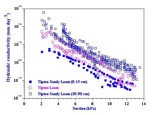 Fig. 6. Unsaturated hydraulic conductivity for layers of different texture classes from three soil pro-files of Tipton sandy loam. The three sites are located within a 2-km region.