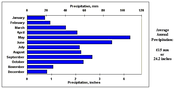 Climate Average annual precipitation in MLRA 78 ranges from 500 to 750 mm, increasing from west to east (Fig. 1). Maximum precipitation is in spring, and the minimum is in winter. Snowfall ranges from 25 cm in the north to 10 cm in the south. The average annual temperature is from 4 to 18 oC, with an average of 185 to 230 freeze-free days. A typical distribution of annual precipitation for the MLRA is shown in Fig. 2.