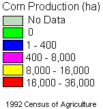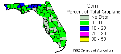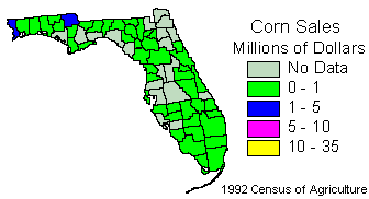 Total corn production for Florida in 1992 was 32,000 hectares. Corn sales for Florida in 1992 were 10 million dollars.