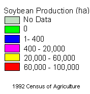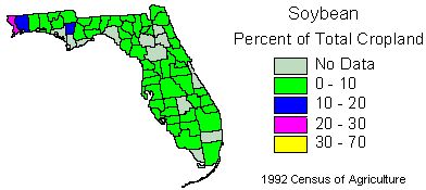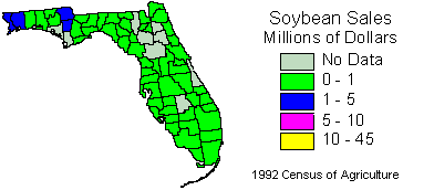 Total soybean production for Florida in 1992 was 18,400 hectares. Soybean sales for Florida in 1992 were 7.0 million dollars.